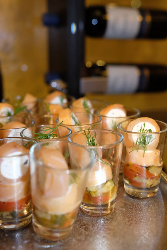 Kleine Schalen mit grünem Püree, garniert mit gehackten roten und gelben Paprika und Kräutern. Kleine, quadratische Schalen mit cremiger Speise, Orangenrogen und Limettenscheiben, arrangiert für eine Veranstaltung. Häppchen aus Schinkenröllchen mit cremiger Füllung und Basilikumblättern in weißen Schalen. Kleine Gläser gefüllt mit Lachs-Häppchen. Lachsrollen, Gemüse und Frischkäse in Shot-Gläsern, garniert mit Dill.