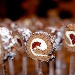 Schokoladen-Cake Pops auf Stäben, mit Schokoglasur überzogen und mit Streifen verziert, in einer Reihe angeordnet. Kleine Gläser mit rosa gebratenem Rindfleisch, belegt mit weißem Dip und Schnittlauch. Nahaufnahme, Fokus auf die Mitte. Kleine, weiße Käsetürmchen in Gläsern, garniert mit Kräutern und lila Gewürz, auf Salatblättern. Schokoladen-Biskuitrouladen-Lollis, gefüllt mit Sahne und Kirschen, auf Stäbchen, mit Schokoladenüberzug und Nüssen.